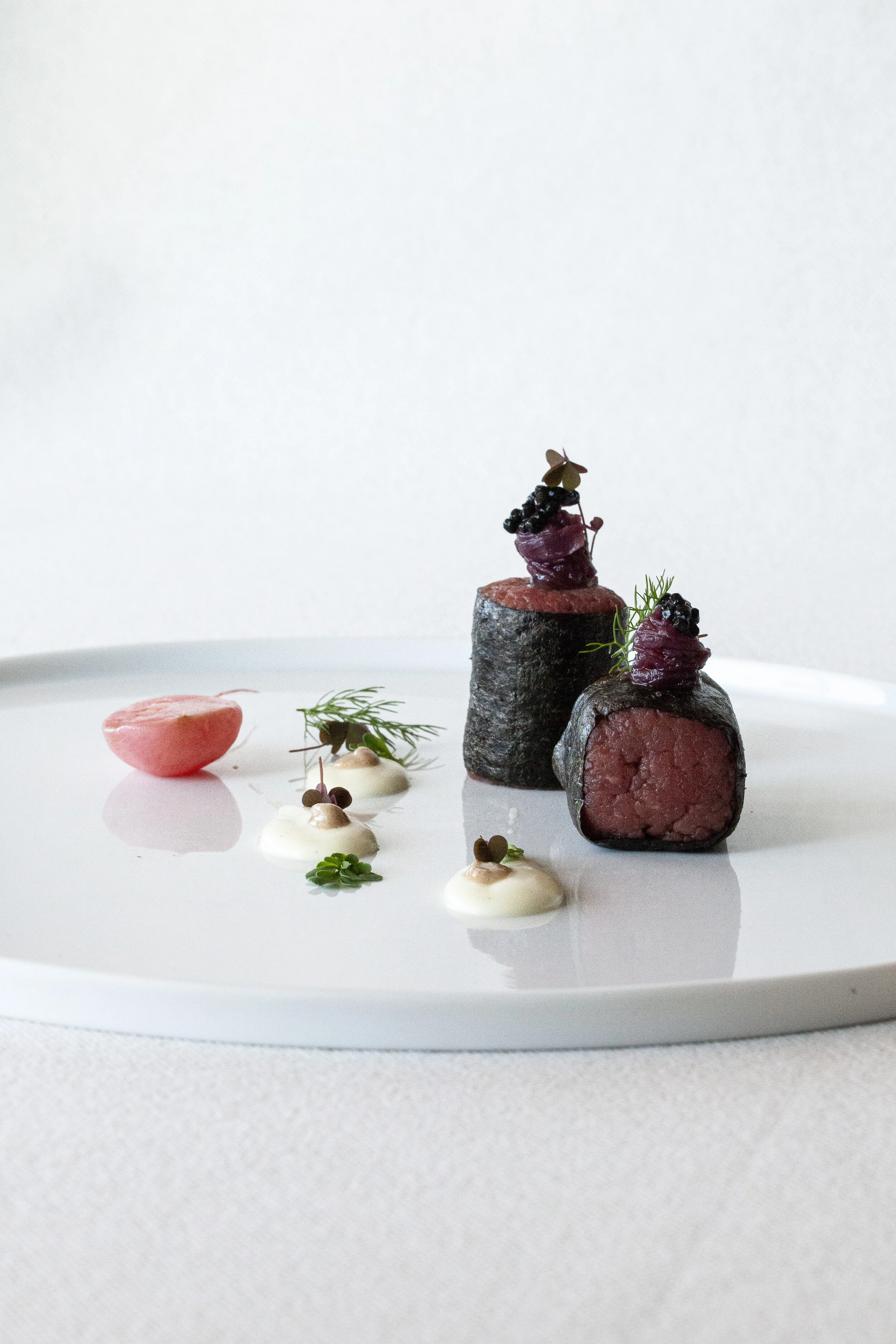 filetto di cavallo alla Bismarck, bagna caoda alla banana e patate arrosto